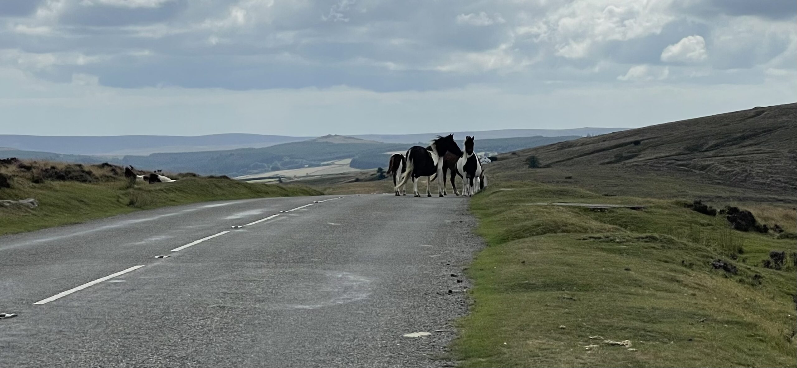 However we do have to stop at the top, where a team of wild horses are proving the truth of the saying “wild horses wouldn’t make me…” by refusing to do anything. The photo shows them grouped to one side of the road but mostly they were spread out across the whole road, entirely indifferent to cars and even to Doris’s wildly dinging bicycle bell.