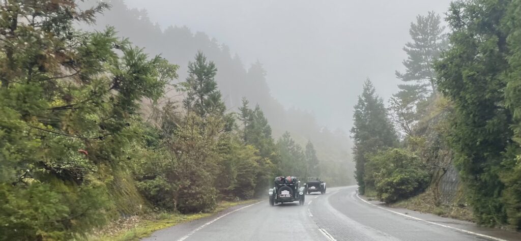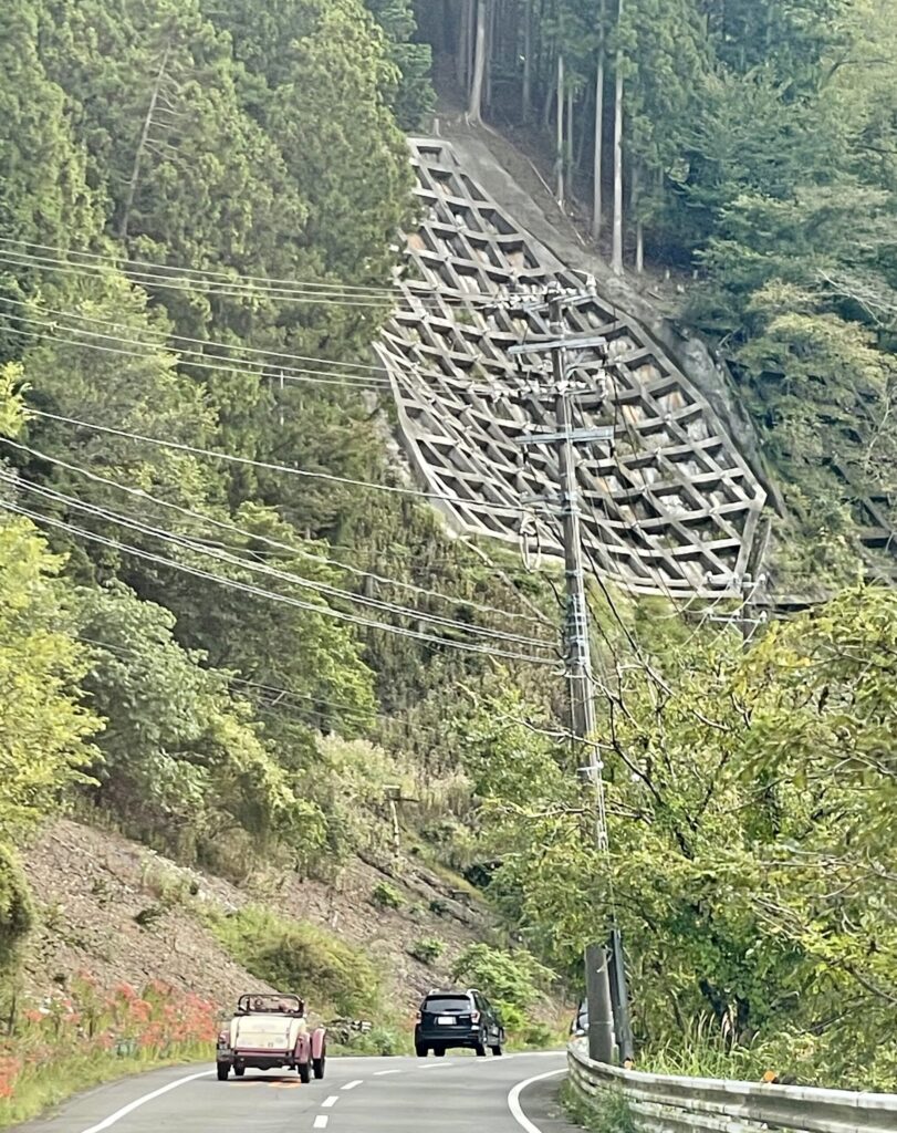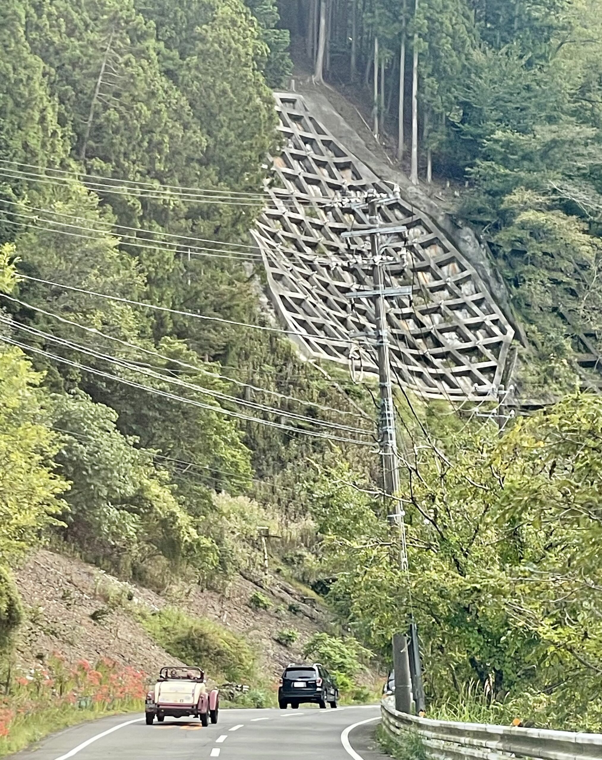 Japan is mountainous and to keep the mountains from falling on the road there is much engineering, seen here not falling on David and Jo in their Chrysler 75.