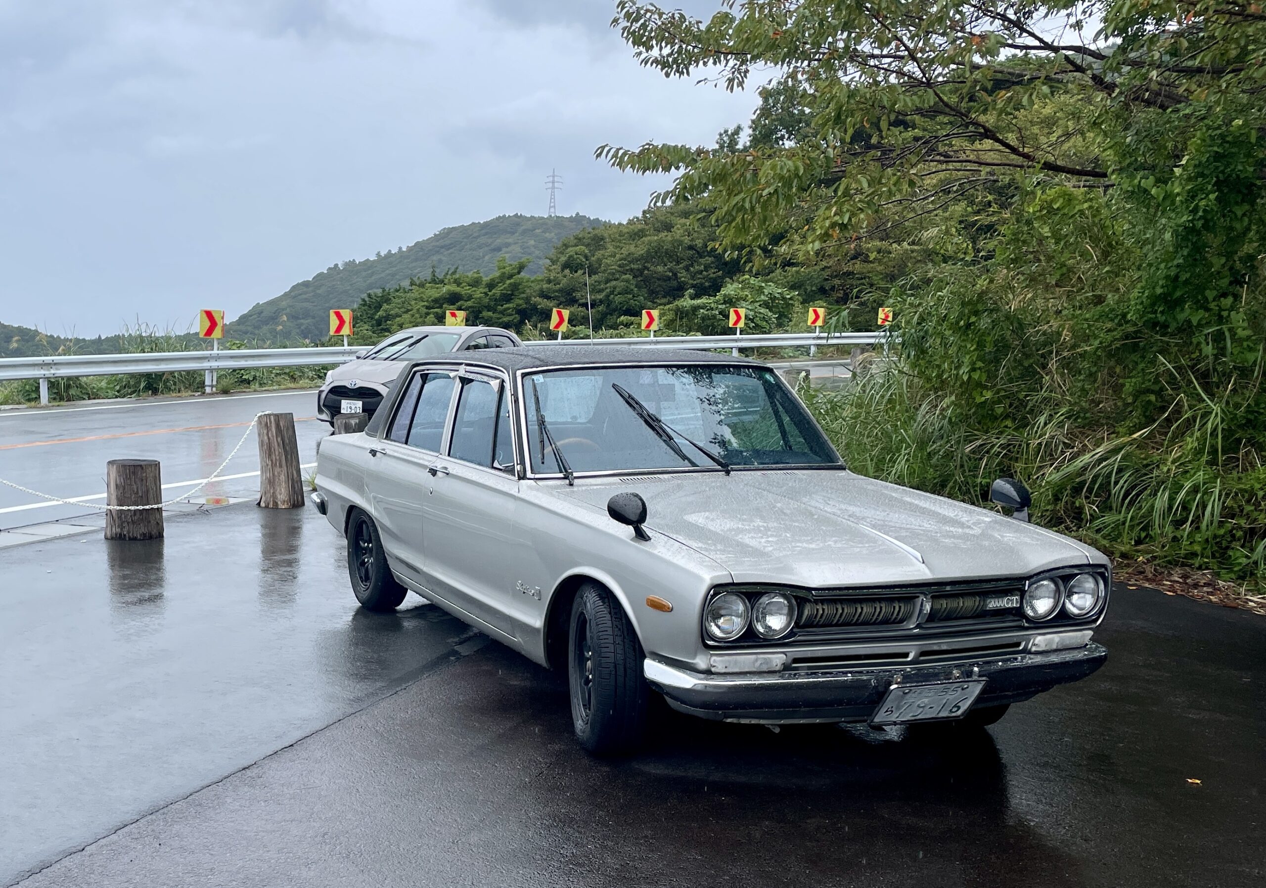 These are tourist roads with few junctions and are a pleasant way of making progress as they are truck free. We come down to coffee on the coast at Numazu Nishiurakisho. Sid goes to take this picture and a woman comes rushing towards him, That’s my car! And she’s right to be pleased. An Alpine 110 in perhaps the best colours standing out in a roadscape of dull.