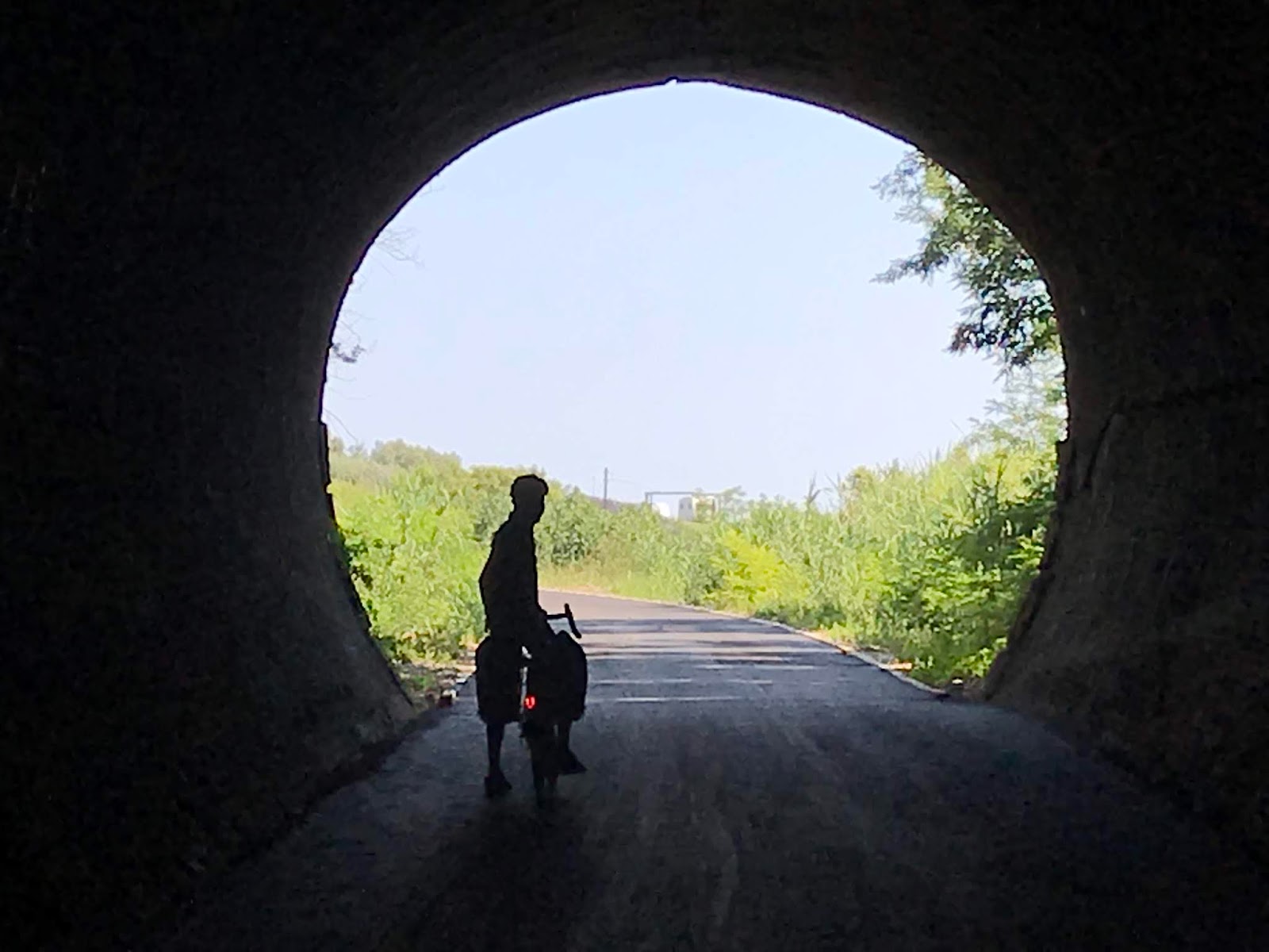 It is very good to be away from even Saturday traffic. However, much of the route is now strada bianchi which while flat in the macro sense is not in the micro, so speeds and comfort come down. Sid is no fan of unsurfaced roads. Anyway we bash along part paved and part bum hurter and have the adventure of going through the old tunnels. Sid and Doris dearly love a bit of Industrial Archeology.