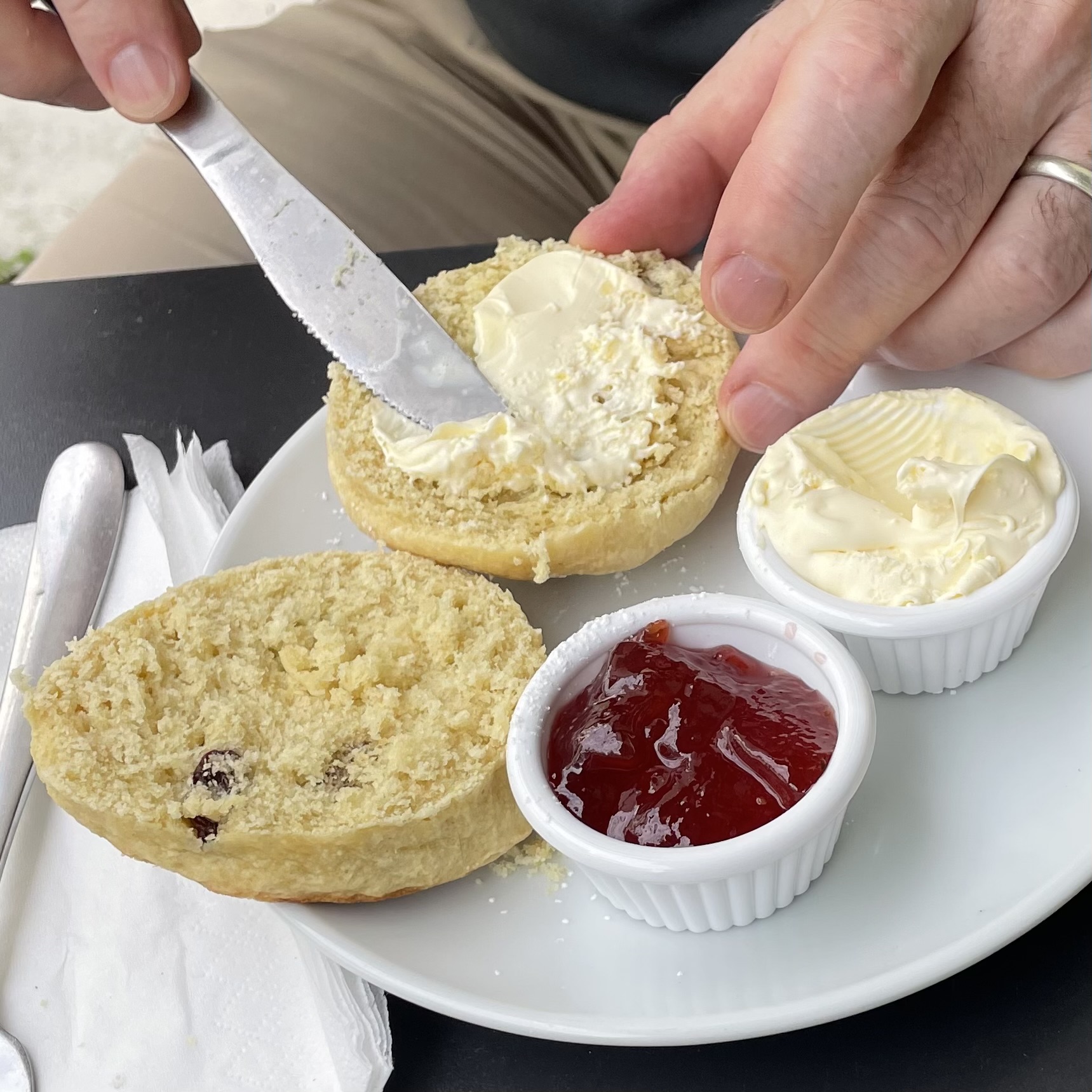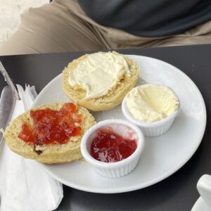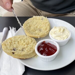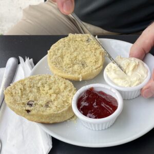 It turns out that Sid’s time at Exeter University has led him into bad ways. Although (I hope my Cornish friends/forefathers are not reading this) as Doris initially watches the progress of the knife with horror, it does look nicer with cream first.