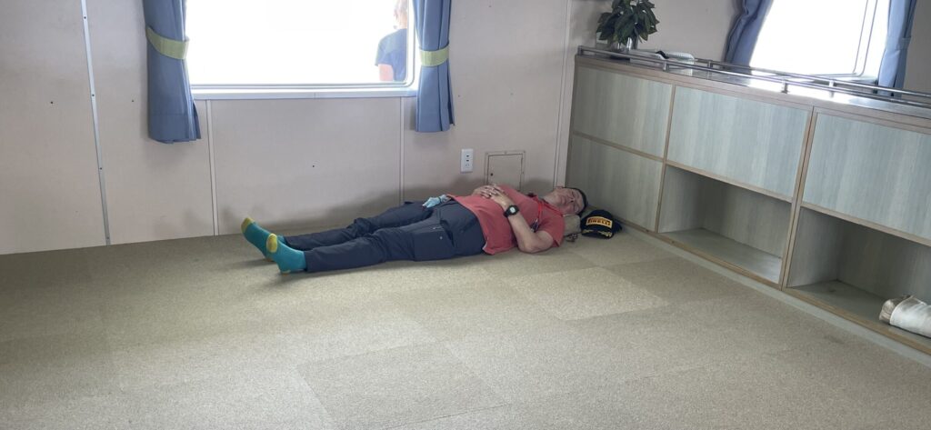 And then the ferry where there are large spaces for customers to stretch out on the carpet (shoeless) for a little sleep. And Sid joins Lorna on the floor.