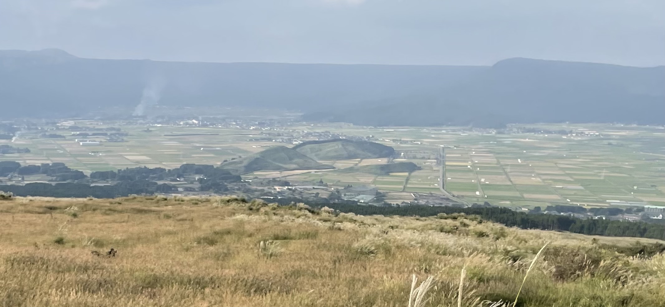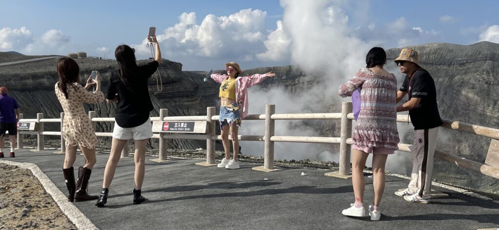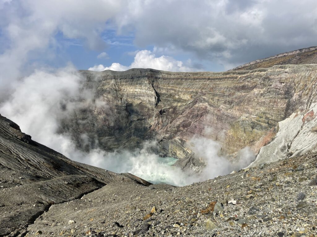 In the afternoon the hard, hot climb up to the still-live Aso volcano that looks over the very large caldera that is witness to previous eruptions. A caldera is a sink hole formed when the remains of a volcano subside into the space vacated by magma when a volcano erupts. At Aso these were once lakes but now form solid enough ground for agriculture, highways and railways.
