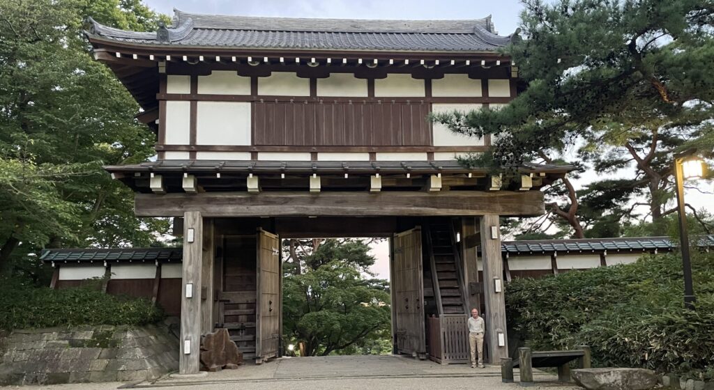 In Akita we had a free night (ie no organised dinner) so Sid and Doris escaped before sunset to walk up to the required this-was-once-a-wooden-castle-before-it-burned-down-and-we-have-now-recreated-it site. In Salisbury Cathedral we talk about “scantlings”, the cross-section of wood that shows how massive a tree once was. This is truly massive indeed, and we think it is made of cedar wood (Sid is included here for scale purposes).