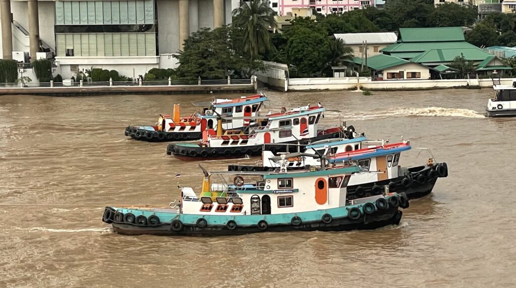 The Riva Surya hotel is on the banks of the Chao Praya with river side pool and terrace, from which S and D love to watch the tug boats working. It takes five or six to get a barge train upstream and two going down. Remember, everybody is normal until you get to know them, and S&D now have about 200 photos of barge formations on the river.