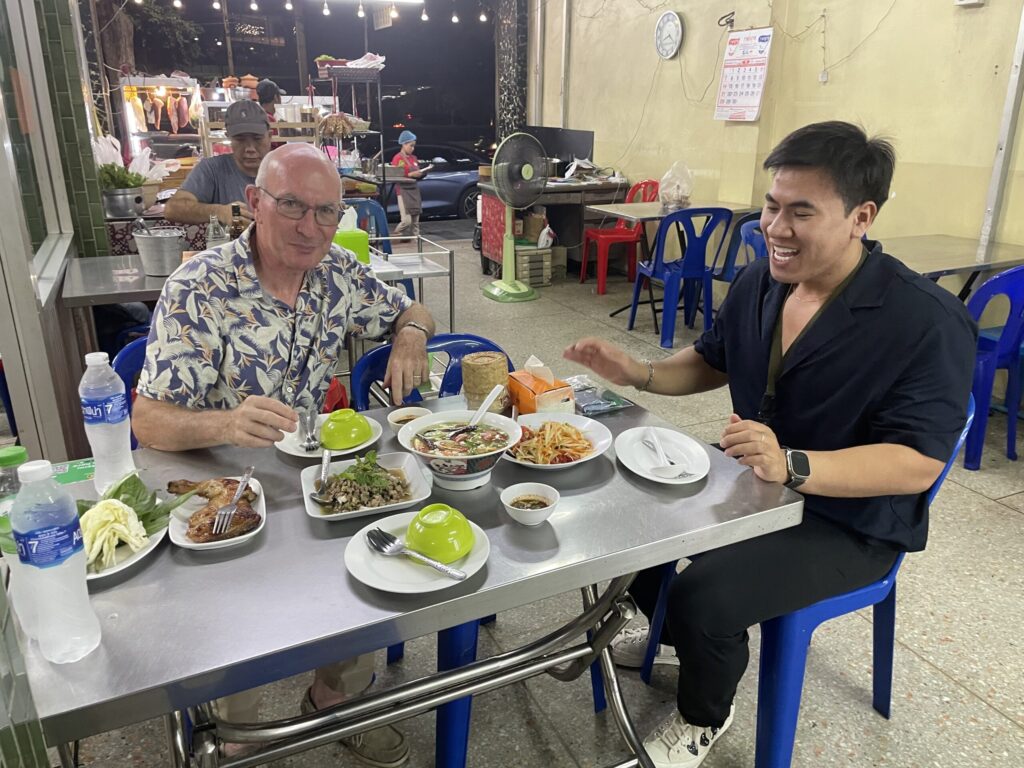So far we’ve eaten in small restaurants, though all clearly geared to the farranger. So as to eat at the real thing we had a tuktuk ride with a foody guide going to ‘this is the place in Bangkok where to eat X’. X was always very nice, and to reinforce the local feeling we were shown an arsonist setting fire to our stir fry.